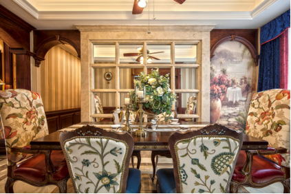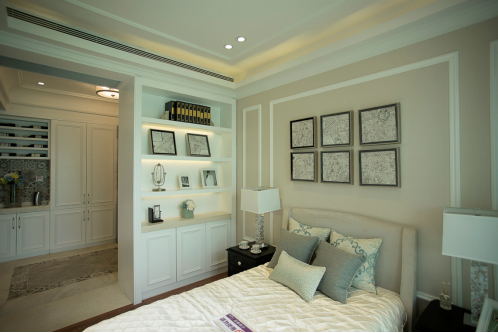 業主屬于成熟、享受生活的人。已有一位三歲小男孩,現正孕育著新成員!夫妻兩個比較喜歡看電影,旅行。喜歡寬敞、明亮、穩重、有檔次。本案例在保證整體效果及舒適度的前提下,充分利用空間,設計了儲藏間、衣帽間、及衣柜,以充分滿足業主的儲物功能。在效果上使用了實木護墻板、墻紙、石材、木板、鏡子等材質,體現了美式的古典、雅致及尊貴美!